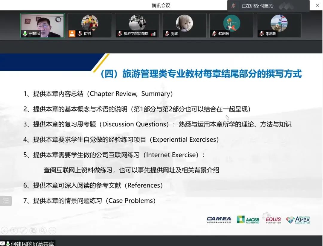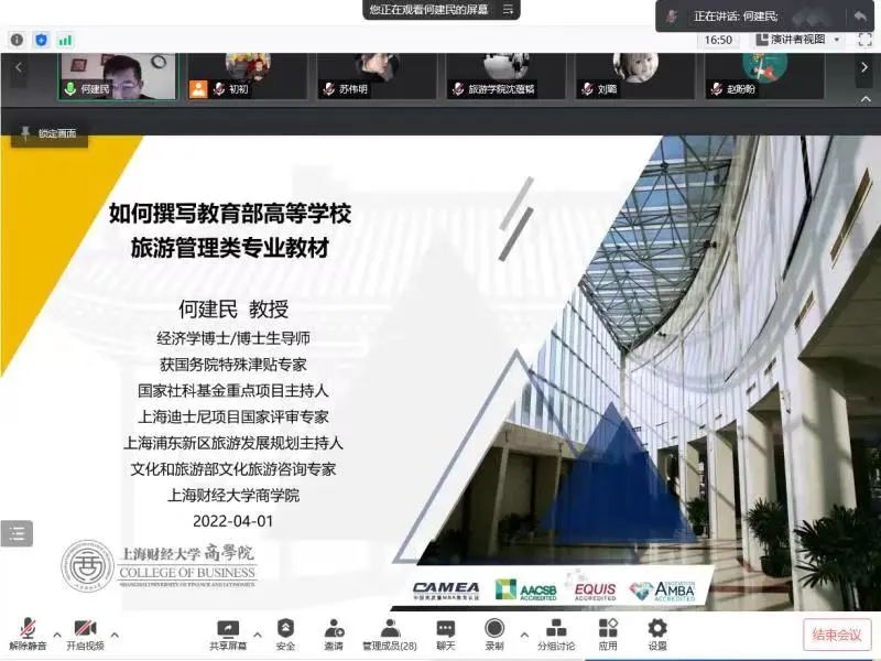 为提升旅游学院教师教科研水平,提升教师撰写旅游管理专业教材的水平,旅游学院于4月1日下午开展了一场题为《如何撰写教育部高等学校旅游管理类专业教材》的线上讲座。本次讲座由国务院特殊津贴专家、国家社科基金重点项目主持人、上海迪士尼项目国家评审专家、上海浦东新区旅游发展规划主持人、文化和旅游部文化旅游咨询专家、上海财经大学商学院博士生导师何建民教授主讲,旅游学院姜文琼院长主持,旅游学院全体教师聆听了本次讲座。