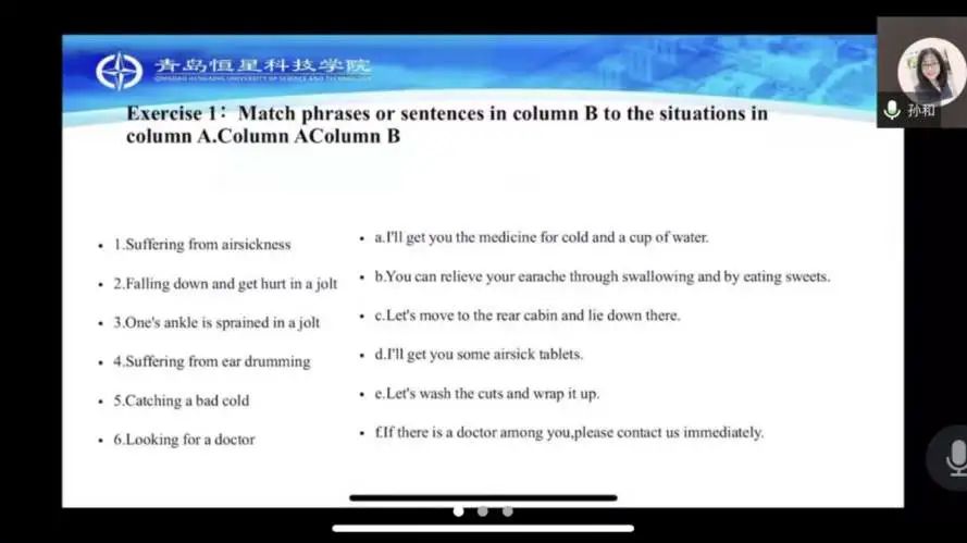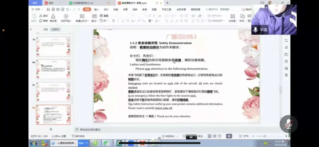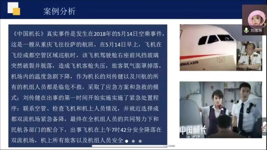 刘璐老师采取讲授法、讨论法等教学方式,同样使用学习通软件对客舱播音技巧课进行讲解,利用学习通抢答以及选人方式开展师生互动。刘老师对本门课程用心思考、深入探究、反复推敲、细致“打磨",通过列举真实案例以及播放视频的方式,把一节普通的常规语言课打造成一节优质精彩的课程。