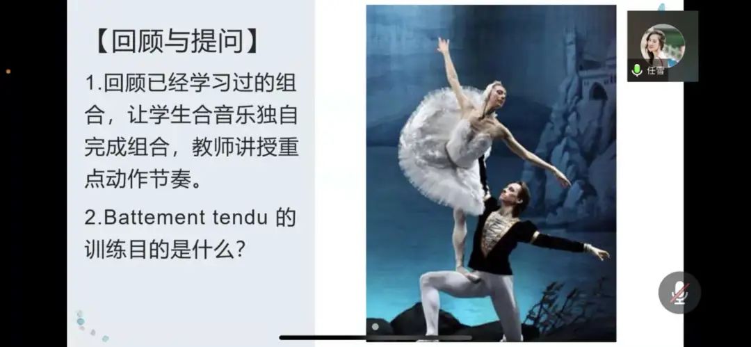 任雪老师带来芭蕾基训课程,虽然其属于实践类课程,但任老师运用学习通与学生进行充分互动。其通过回顾与提问的方式引入本次课程的主题,在课程中插入脚位练习视频并指出视频中容易出错和混淆的动作,PPT内容丰富,简洁易懂。