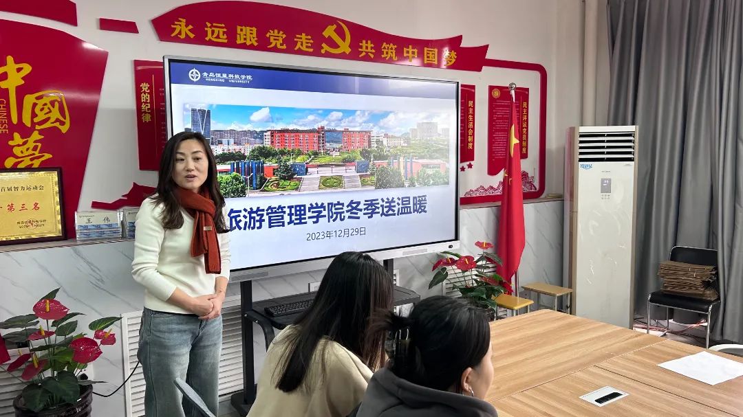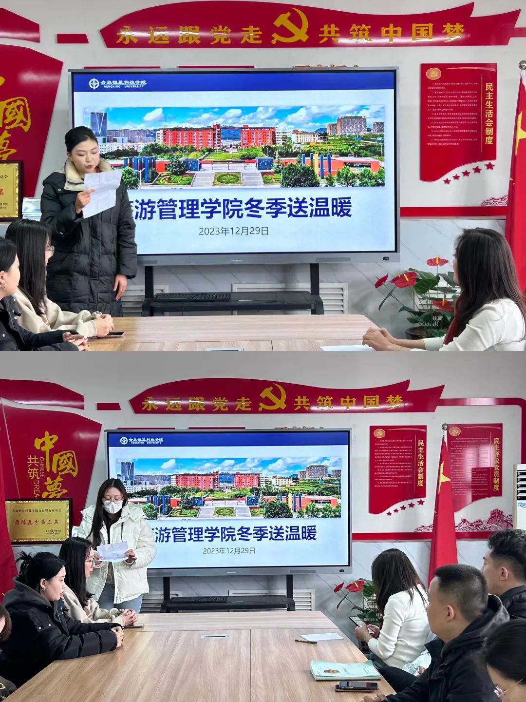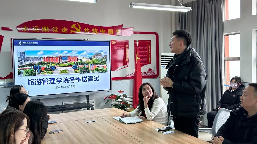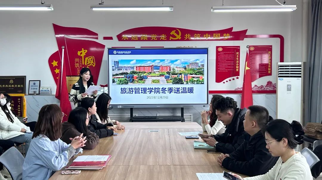 随着冬季的来临,气温逐渐降低,为了帮助贫困学生度过一个温暖的冬天,确保全院师生温暖度过寒冬,提升学院凝聚力。旅游管理学院于2023年12月29日下午2点在A2教学楼611会议室举办本次“蓬门轻掩,暖意悄然”——冬季送温暖活动。参加此次活动的有旅游管理学院团总支书记尚园、行业院长沈蕴韬;辅导员段存德老师、张晓艳老师、徐爽老师、单翔宇老师、王伟杰老师、杨珍老师、刘晗老师以及程明豫老师。
