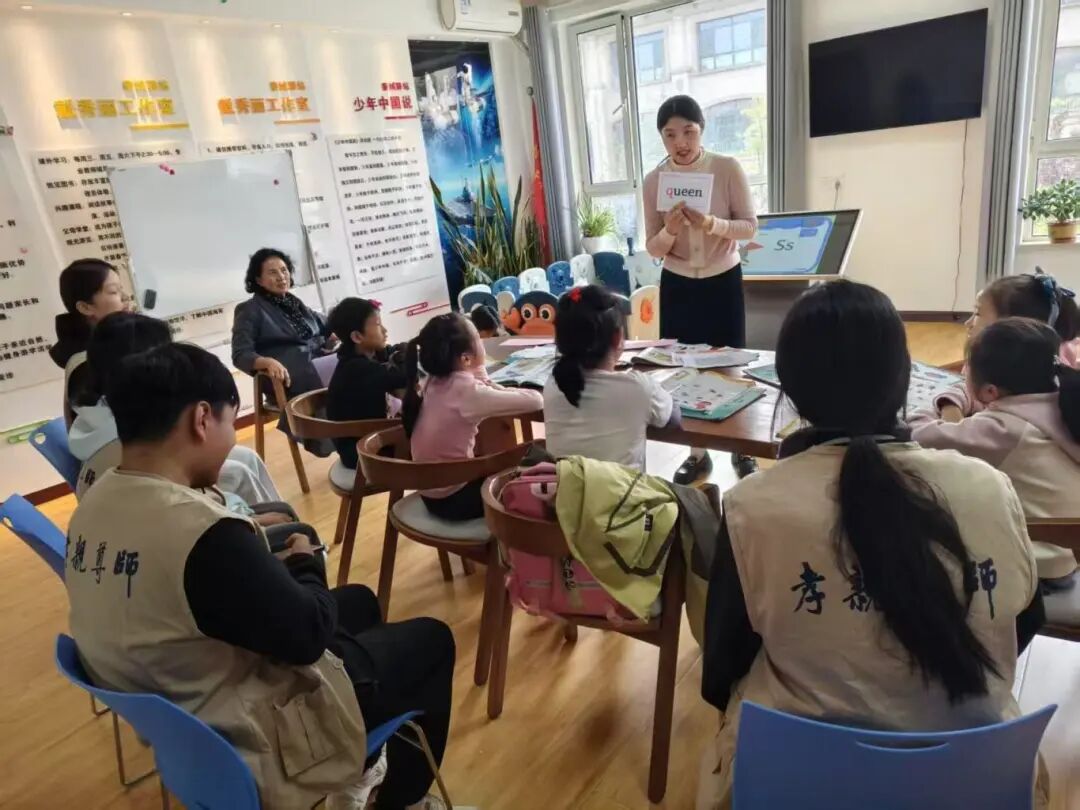 在英语互动环节,志愿者打破传统教学思路,采用“玩中学、学中玩”的教育方式。通过“单词搭配问答”“指物提问”等游戏,他们用夸张的肢体动作与生动的发音,引导幼儿主动跟读、大胆表达,不仅激发了幼儿对英语的兴趣,更培养了幼儿运用英语单词的思维。
