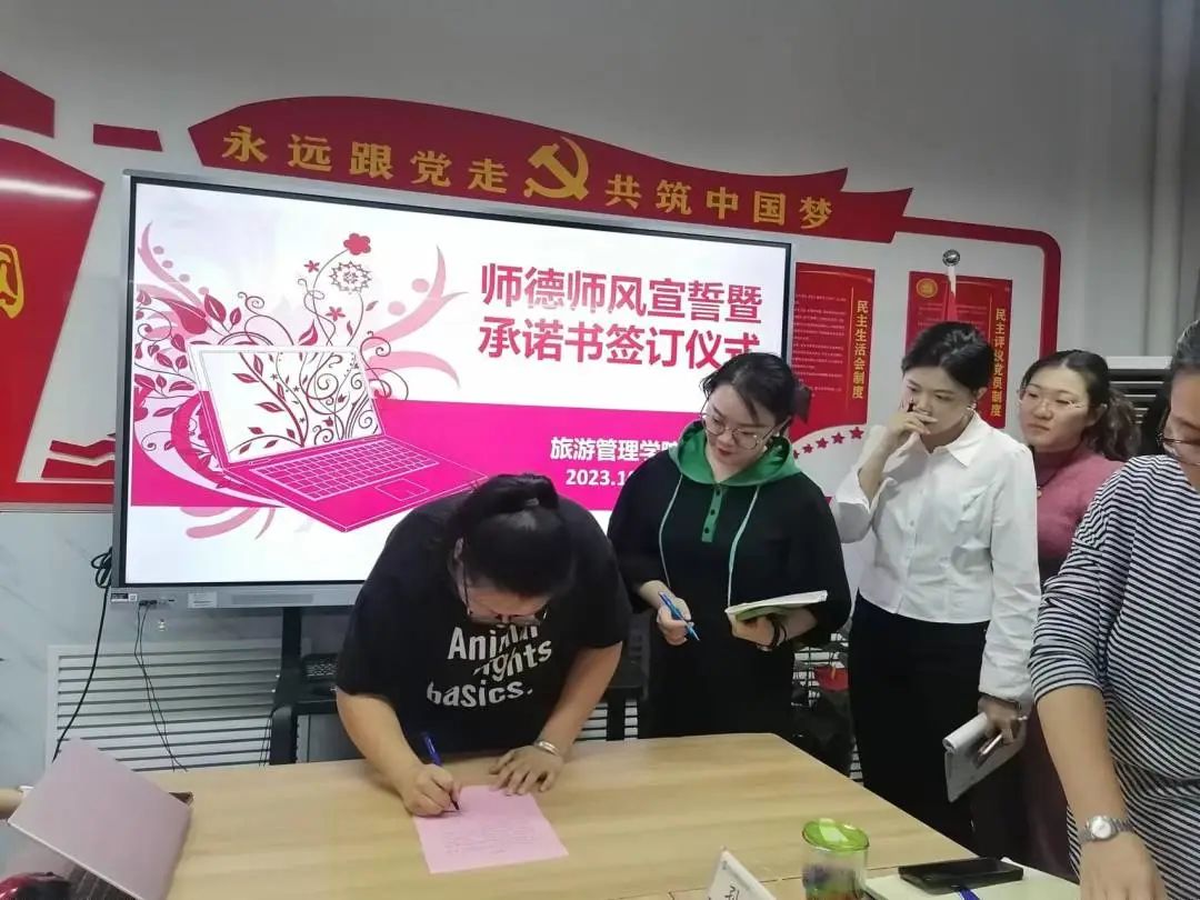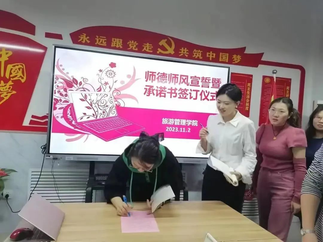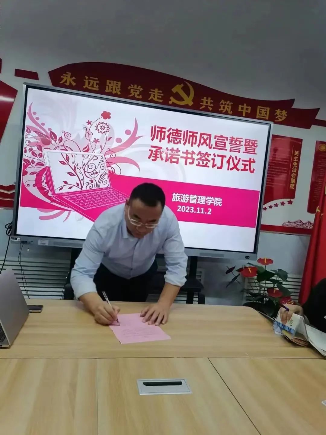 为积极响应学校关于开展师德师风建设月工作指示,坚决落实师德师风第一标准,加强新形势下师德师风建设,旅游管理学院于2023年11月2日在A2-611会议室举行“师德师风建设月”宣誓暨承诺书签订仪式。