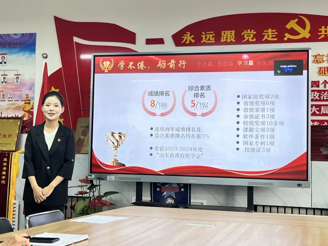 经个人申报、资格审核与初步筛选,共有17名候选人进入本次答辩环节,分别是李润智、沈憶雯、朱林、周佟、罗骅鋆、孟令君、张鲁娜、李晨晖、郭清艺、刘立彤、于舒婷、朱家欣、李雅琪、李延硕、路兴娜、王筠惠、张丁芬和赵瑜轩。在答辩环节中,候选人按行业学院顺序依次进行3-5分钟的自我陈述,主要围绕学业成绩、科研创新、社会实践、志愿服务、学生工作及综合素质等方面来陈述,全面展现了个人的专业素养、开阔的视野格局与奋斗的成长轨迹。陈述结束后,评审老师围绕学生的综合素质、现实表现与发展潜力并结合奖学金评审条件进行现场打分。