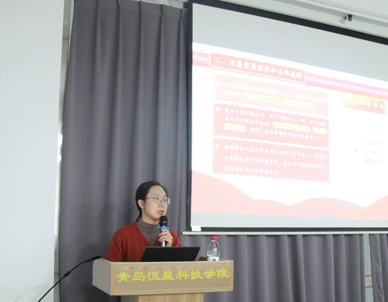 11月23日,单翔宇老师为同学们讲解了发展党员的工作流程,详细介绍了新形势下发展党员的工作要求以及发展党员程序和工作流程。追光的人,终会光芒万丈。我们要积极向党员靠近,做时代中的先行者,向阳而生!心中有党,成绩理想,我的生命忠于党,我的信仰光芒万丈!