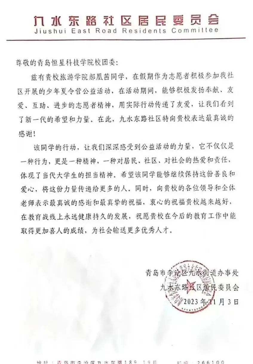 近日,青岛市李沧区九水街道办事处、九水东路社区居民委员会给我校团委发来表扬信,对我院学子郝凰茜同学在假期作为志愿者积极参加九水东路社区开展的少年夏令营公益活动的行为以及所传达出来的奉献、友爱、互助、进步的志愿者精神给予表扬。