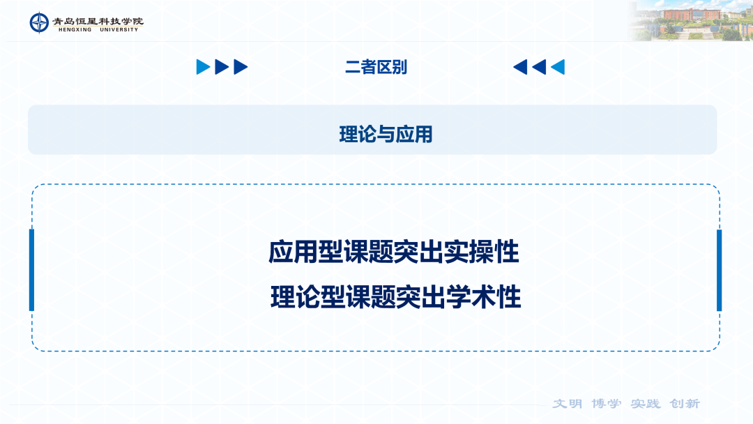 首先,王院长指出应用型课题与理论型课题的二者区别,即应用型课题突出实操性,理论型课题突出学术性。