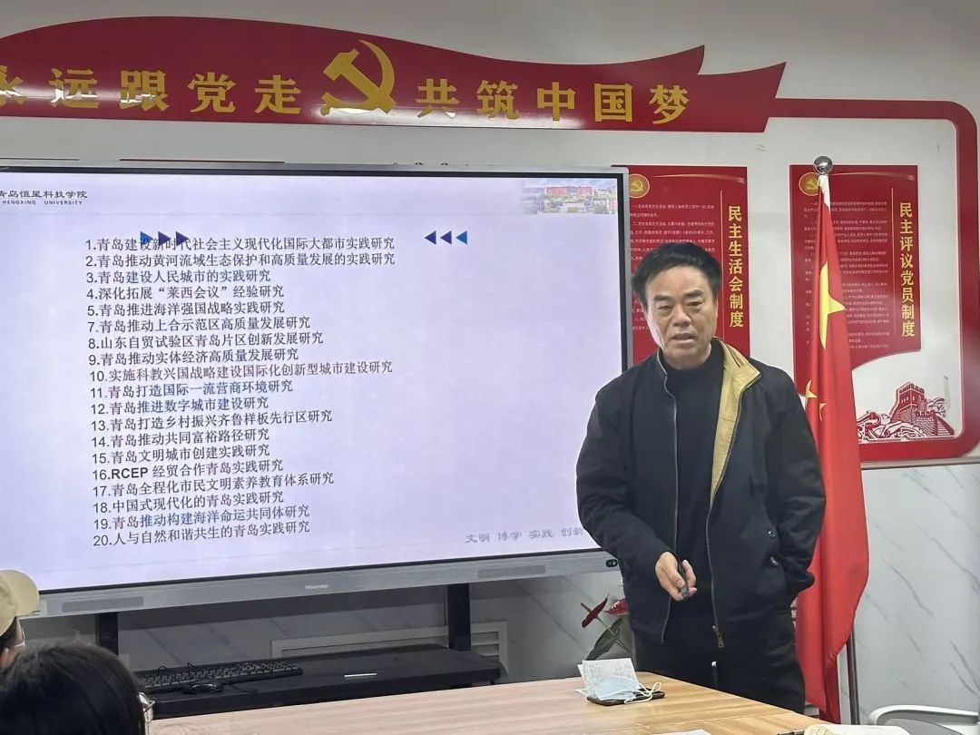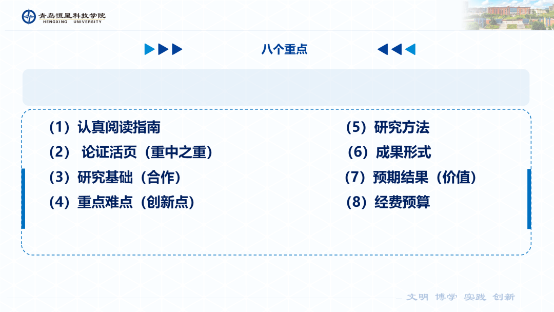 最后,关于课题申报书填,王院长指明了八个重点,提出了一个要求。并以《2023 年青岛市社会科学规划研究项目课题指南》为切入,从经济学、管理学、教育学三个方面展开,提出了许多课题例子,帮助教师们深刻理解。