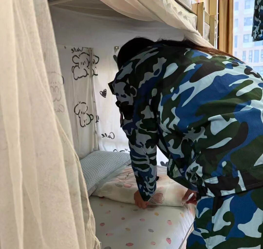 训练途中,天空突降大雨。新生们有序回到宿舍,随即投入到内务整理中。宿舍内,他们将被子叠成规整的“豆腐块”,床单铺平拉正,物品摆放得井然有序。这不仅是对生活习惯的规范,更是军训中自律精神的延伸,彰显着旅管新生们对自身要求的严格与对集体生活的用心。