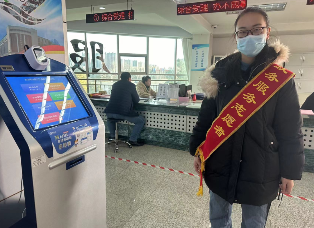 宫晨昀同学在行政审批服务局从事大厅引导员的工作,为来到行政审批局办理业务的人们进行指引,提高办事效率,为人们节省时间。