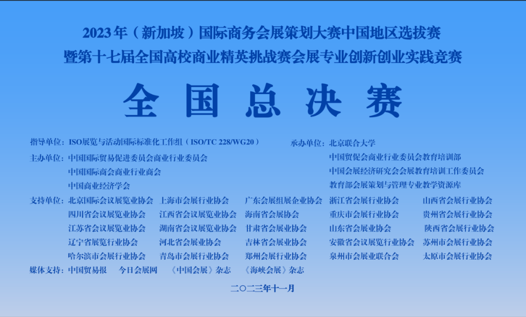 2023年11月11日,由中国国际贸易促进委员会商业行业委员会、中国国际商会商业行业商会与中国商业经济学会共同主办的2023年(新加坡)国际商务会展策划大赛中国地区选拔赛暨第十七届全国高校商业精英挑战赛会展专业创新创业实践竞赛和酒店竞赛在线成功举办,此次竞赛活动得到了北京、上海、广州、浙江、四川、山西、山东等30个省市的会展行业协会的大力支持。