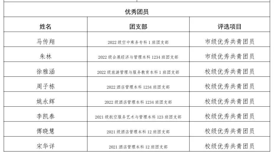 按照青恒团发【2024】4号文件精神,在推荐共青团青岛恒星科技学院委员会2023年度五四红旗团支部、优秀共青团员的过程中,学院于2024年3月5日在青岛恒星科技学院旅游管理学院网站及公众号公示“关于推荐共青团青岛恒星科技学院委员会2023年度五四红旗团支部、优秀共青团员名单的公示”,公示期为三天(2024年3月5日-3月7日),公示无任何异议。同意推选以下团支部和个人成为本年度“五星红旗团支部、优秀共青团员”